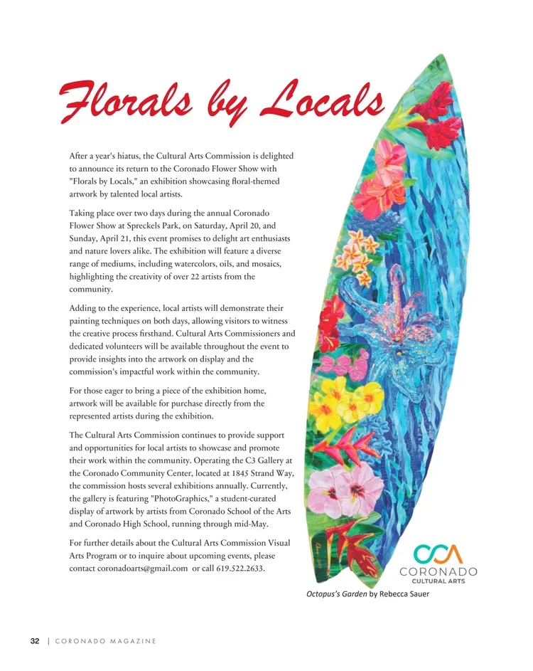 Rebecca Sauer’s work has been featured in Emerald C Gallery and other venues throughout Coronado, California. Her work has been displayed on public banners, was chosen twice to be the cover art for the UCSD Journal of Nursing, and she was the subject of an article in the Coronado Eagle & Journal.